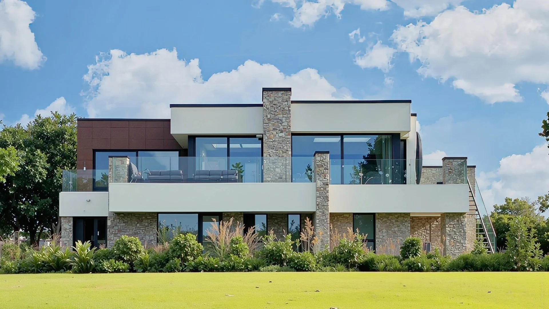 To anchor the house harmoniously within the site, we employed natural stone as an external material, lending a sense of permanence and connection to the surroundings. The skillful combination of render, porcelain cladding, and extensive glazing imbues the building with a lightweight and contemporary aesthetic, perfectly balancing its visual impact with the beauty of its natural surroundings.